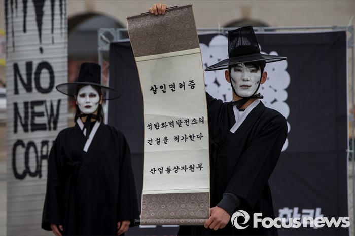 (서울=포커스뉴스) 3일 오전 서울 종로구 광화문 광장에서 그린피스 회원들이 충남지역 신규 석탄화력발전소 허가 취소를 촉구하는 퍼포먼스를 펼치고 있다.