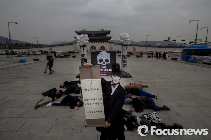(서울=포커스뉴스) 3일 오전 서울 종로구 광화문 광장에서 그린피스 회원들이 충남지역 신규 석탄화력발전소 허가 취소를 촉구하는 퍼포먼스를 펼치고 있다.