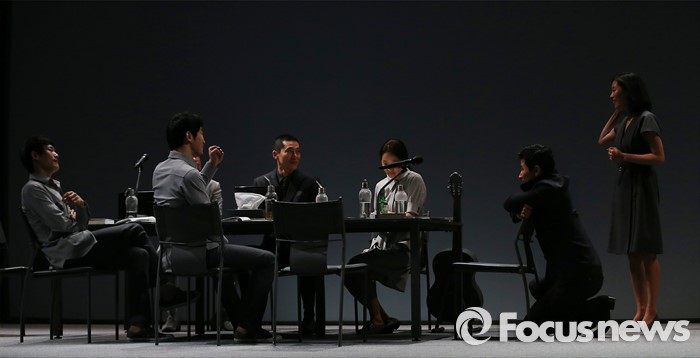 (서울=포커스뉴스) 3일 오후 서울 중구 명동예술극장에서 열린 연극 '빛의 제국' 프레스콜 행사에 참석한 출연진이 주요장면을 시연하고 있다.