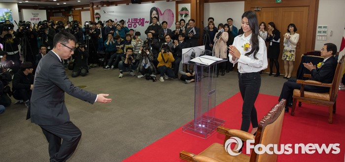 (과천=포커스뉴스) 3일 오후 경기도 과천시 중앙선거관리위원회에서 열린 '아름다운 선거 홍보대사 위촉식'에 참석한 그룹 AOA의 가수 설현이 인사말을 마치고 자리로 향하고 있다.