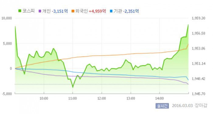 3일 코스피지수는 전일 대비 0.55%(10.75포인트) 오른 1958.17에 장을 마쳤다. 코스피가 종가 기준으로 1950선을 회복한 것은 지난해 12월 30일 이후 약 두 달만이다.
