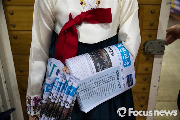 (서울=포커스뉴스) 3일 오후 서울 종로 한국기독교100주년 기념관에서 열린 기독자유당 창당대회에서 한 참가자가 창당 관련 정보가 담긴 신문을 들고 행사장 앞에 서있다.