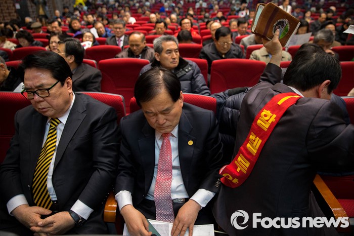 (서울=포커스뉴스) 3일 오후 서울 종로 한국기독교100주년 기념관에서 열린 기독자유당 창당대회에서 참가자들이 기도를 하고 있다.