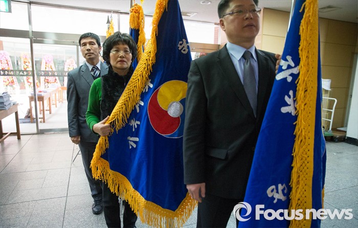 (서울=포커스뉴스) 3일 오후 서울 종로 한국기독교100주년 기념관에서 열린 기독자유당 창당대회에서 참가자들이 기독자유당을 상징하는 깃발을 들고 서있다.