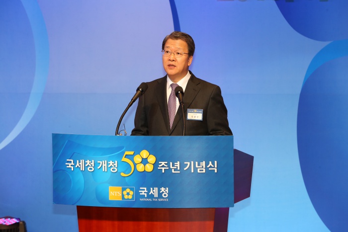(세종=포커스뉴스) 3일 오후 세종시 정부세종 2청사 국세청에서 열린 '성실납세 감사 행사 및 개청 50주년 기념식'에서 임환수 국세청장이 기념사를 하고 있다. <사진제공=국세청>