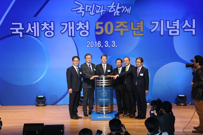 (세종=포커스뉴스) 3일 오후 세종시 정부세종 2청사 국세청에서 열린 '성실납세 감사 행사 및 개청 50주년 기념식'에서 임환수 국세청장과 내빈들이 축하 퍼포먼스를 하고 있다. <사진제공=국세청>
