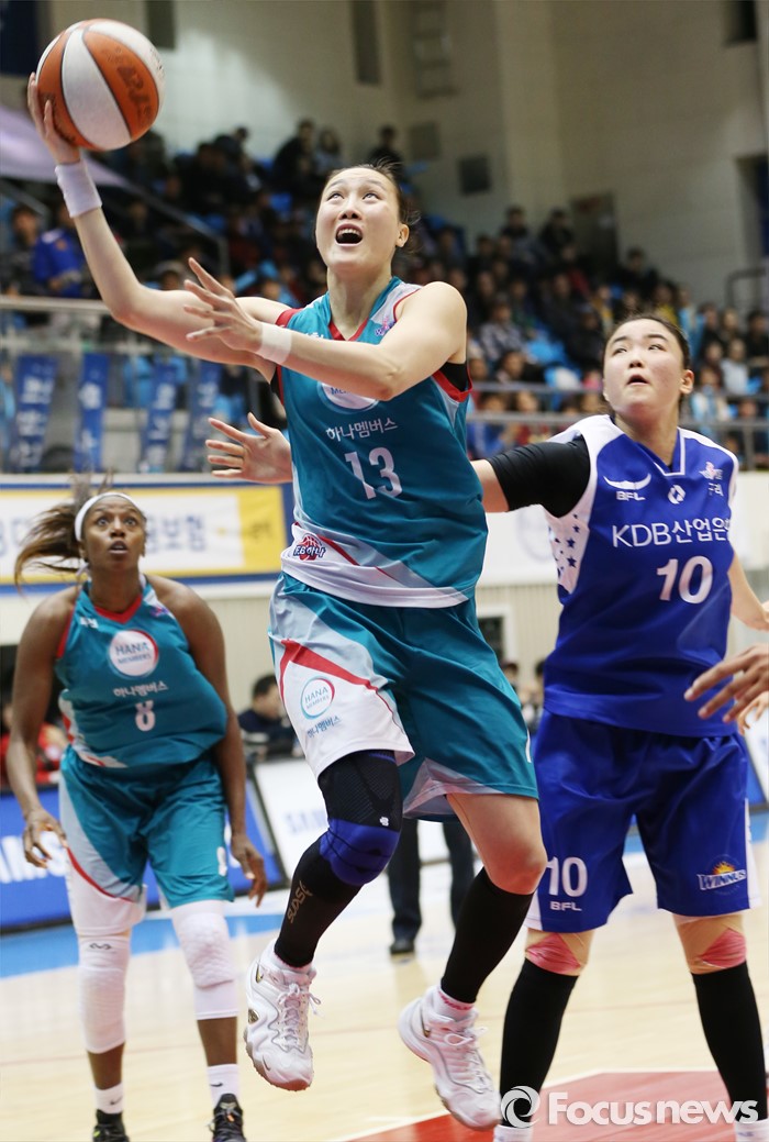 (구리=포커스뉴스) 3일 구리시체육관에서 열린 2015~2016 여자프로농구 KDB생명- KEB하나 경기에서 KEB하나 김정은이 KDB생명 최원선의 마크를 뚫고 레이업슛을 시도하고 있다.