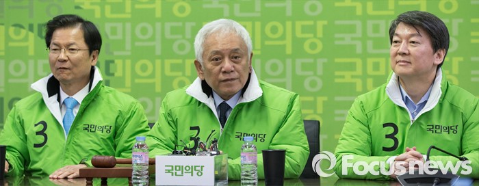 (서울=포커스뉴스) 국민의당 안철수, 천정배 상임공동대표 와 김한길 선거대책위원장이 4일 오전 국민의당 당사에서 열린 4차 선거대책 회의에 참석하고 있다. 오른쪽부터 안 대표, 김한길 선대위원장, 천 대표