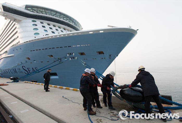 (인천=포커스뉴스) 4일 오전 인천 연수구 송도신항에 정박해 있는 아시아 최대 크루즈인 '퀀텀 오브 더 시즈'호 관계자들이 접안하고 있다.