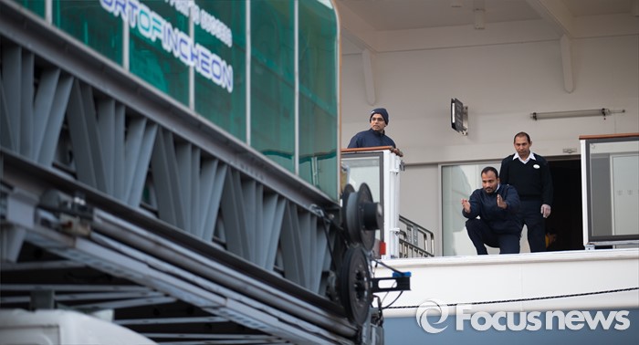 (인천=포커스뉴스) 4일 오전 인천 연수구 송도신항에 정박해 있는 아시아 최대 크루즈인 '퀀텀 오브 더 시즈'호 관계자들이 접안하고 있다.