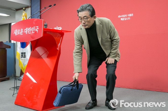 (서울=포커스뉴스) 이한구 새누리당 공천관리위원장이 4일 오전 서울 여의도 새누리 당사에서 당내 지역 예비후보 여론조사 문건 유출과 관련, 브리핑을 마친 뒤, 단상을 내려가고 있다.