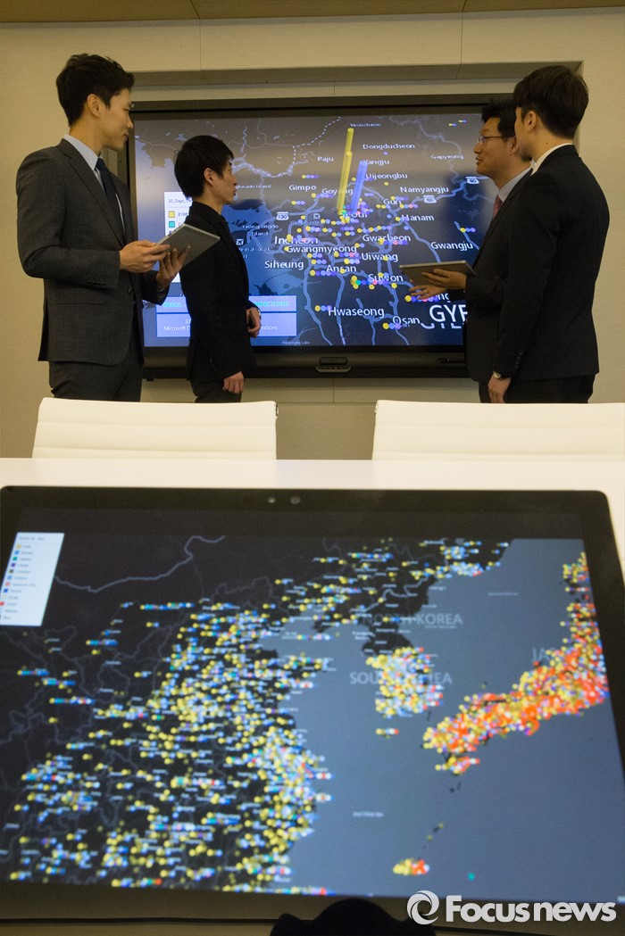 (서울=포커스뉴스) 4일 오전 서울 종로구 한국마이크로소프트에서 열린 '사이버보안센터 개관식'에서 직원들을 비롯한 관계자들이 MALWARE(악성코드) 분포도를 확인하고 있다.