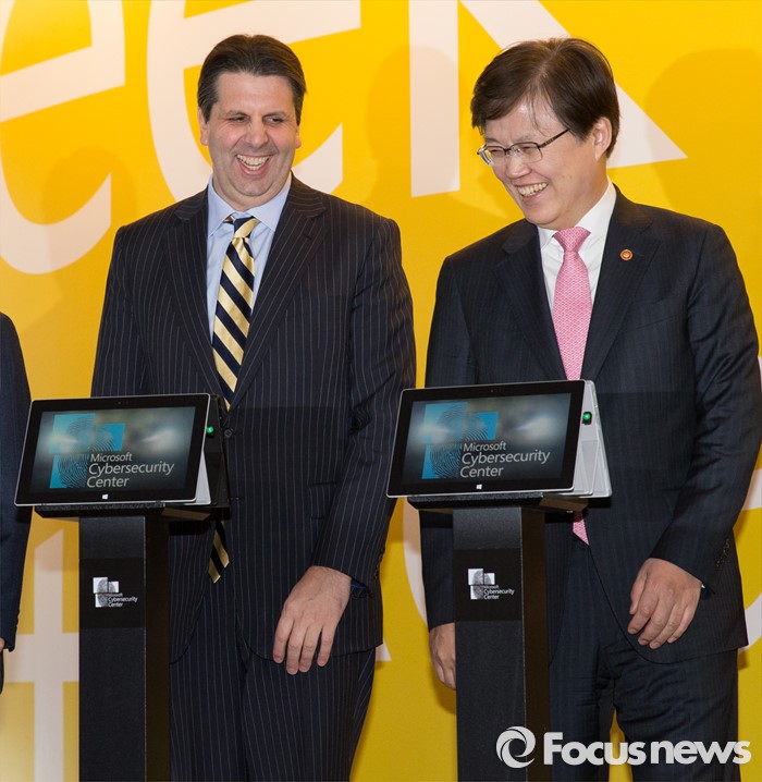 (서울=포커스뉴스) 4일 오전 서울 종로구 한국마이크로소프트에서 열린 '사이버보안센터 개관식'에서 마크 리퍼트(왼쪽) 주한미대사와 최양희 미래창조과학부 장관이 대화를 나누고 있다.