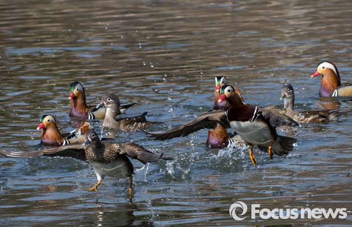 (서울=포커스뉴스) 동면하던 동물이 땅속에서 깨어난다는 경칩을 하루 앞둔 4일 오전 서울 종로구 창경궁 춘당지에서 원앙들이 봄의 기운을 알리듯 힘차게 날갯짓을 하고 있다.