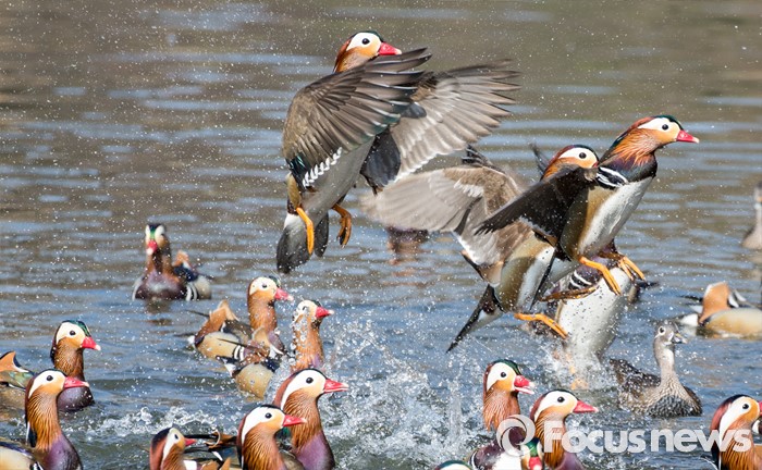 (서울=포커스뉴스) 동면하던 동물이 땅속에서 깨어난다는 경칩을 하루 앞둔 4일 오전 서울 종로구 창경궁 춘당지에서 원앙들이 봄의 기운을 알리듯 힘차게 날갯짓을 하고 있다.