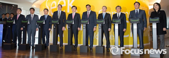 (서울=포커스뉴스) 4일 오전 서울 종로구 한국마이크로소프트에서 열린 '사이버보안센터 개관식'에서 강성조(왼쪽부터) 행정자치부 개인정보보호정책관, 이동훈 고려대학교 정보보호대학원장, 이운주 경찰청 사이버안전국장, 마크 리퍼트 주한미대사, 최양희 미래창조과학부 장관, 세자르 세르누다 마이크로소프트 아시아태평양 지역 사장, 김영대 대검찰청 과학수사부장, 백기승 한국인터넷진흥원 원장, 고순동 한국마이크로소프트 대표이사, 백지아 외교부 국제안보대사가 디지털 테이프 커팅에 앞서 기념촬영을 하고 있다.
