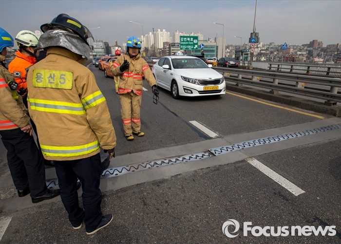 (서울=포커스뉴스) 4일 오후 서울 용산구 반포대교 상판 연결 이음매 부분이 가라앉아 소방대원들이 원인을 조사하고 있다.