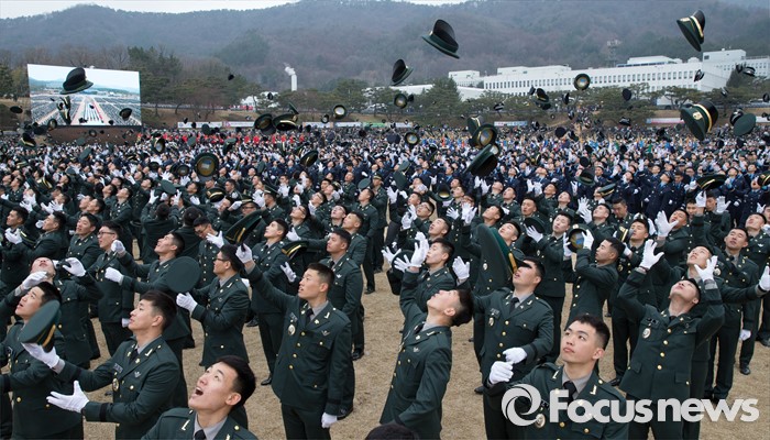 (계룡=포커스뉴스) 4일 오전 충남 계룡대 연병장에서 열린 2016년 장교 합동임관식 리허설에서 신임장교들이 정모를 하늘로 던지고 있다.