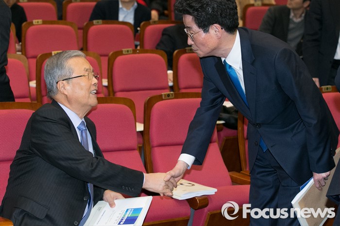 (서울=포커스뉴스) 김종인(왼쪽) 더불어민주당 비대위 대표와 이목희 정책위의장이 4일 오후 서울 여의도 국회 의원회관에서 열린 소상공인 20대 총선 정책공약 전달식에 참석해, 악수하고 있다.