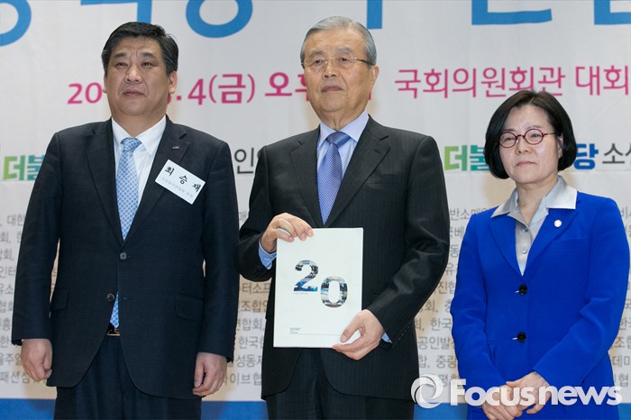 (서울=포커스뉴스) 김종인(가운데) 더불어민주당 비대위 대표가 4일 오후 서울 여의도 국회 의원회관에서 열린 소상공인 20대 총선 정책공약 전달식에 참석해, 최승재(왼쪽) 소상공인연합회 회장으로부터 정책공약집을 전달받고, 기념사진을 찍고 있다. 오른쪽은 전순옥 더민주 의원.