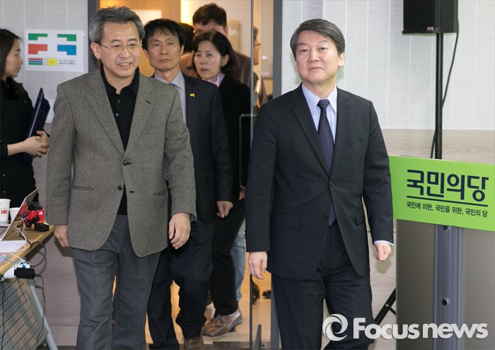 (서울=포커스뉴스) 안철수(오른쪽) 국민의당 상임공동대표가 4일 오후 서울 마포구 당사에서 열린 선거관리위원장 및 위원 위촉장 수여식에 참석해 위원장으로 위촉된 김종현 동아대학교 전임교수와 함께 입장하고 있다.