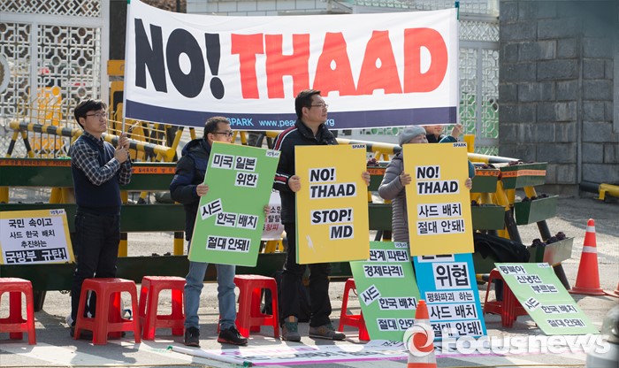(서울=포커스뉴스) 주한미군의 사드 배치문제를 협의하기 위한 한·미 공동실무단 첫 회의가 개최될 예정인 4일 오후 서울 용산구 국방부 앞에서 평화와 통일을 여는 사람들 회원들이 사드 배치를 반대하는 집회를 하고 있다.
