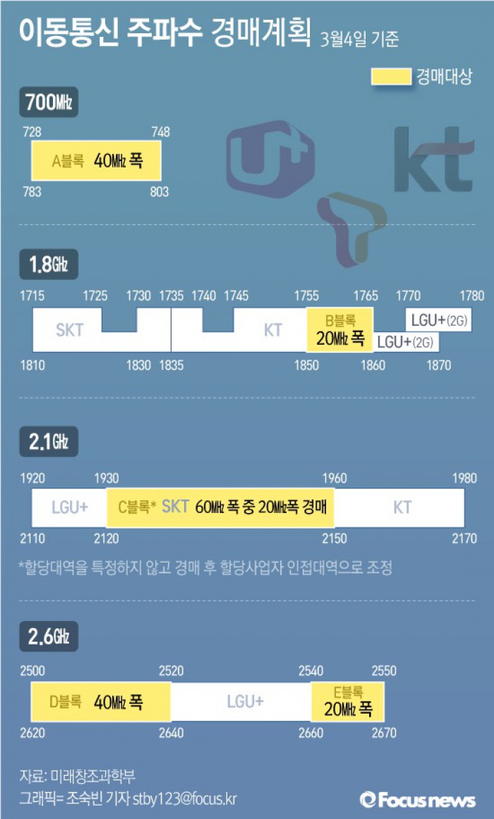 (서울=포커스뉴스) 4일 미래창조과학부가 발표한 ‘2016년 이동통신용 주파수경매 계획(안)’에 따르면 이번에 경매에 나온 주파수는700㎒ 대역 40㎒폭, 1.8㎓ 대역 20㎒폭, 2.1㎓ 대역 20㎒폭, 2.6㎓ 대역 40㎒폭 및 20㎒폭 등 5개 블록, 총 140㎒폭이다.