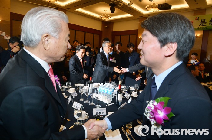 (서울=포커스뉴스) 4일 오후 서울 강남구 프리마호텔에서 전국호남향우회 정기총회에 참석한 김종인(가운데) 더불어민주당 비상대책위원회 대표와 안철수(오른쪽) 국민의당 상임공동대표가 내빈들과 인사하고 있다.