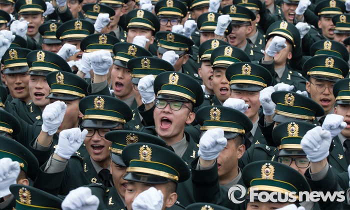 (계룡=포커스뉴스) 4일 오후 충남 계룡대 연병장에서 열린 2016년 장교 합동임관식에서 신임장교들이 구호를 외치고 있다.