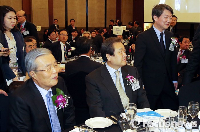 (서울=포커스뉴스) 김종인(왼쪽) 더불어민주당 비대위 대표와 안철수(오른쪽) 국민의당 상임공동대표가 4일 오후 서울 강남구 프리마호텔에서 열린 전국호남향우회 정기총회에 참석해 인사한 뒤 자리로 향하고 있다. 가운데는 김무성 새누리당 대표.
