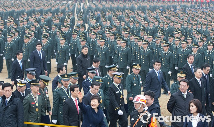 (계룡=포커스뉴스) 4일 오후 충남 계룡대 연병장에서 열린 2016년 장교 합동임관식에서 박근혜 대통령이 신임 장교들과 가족들에게 인사를 하고 있다.