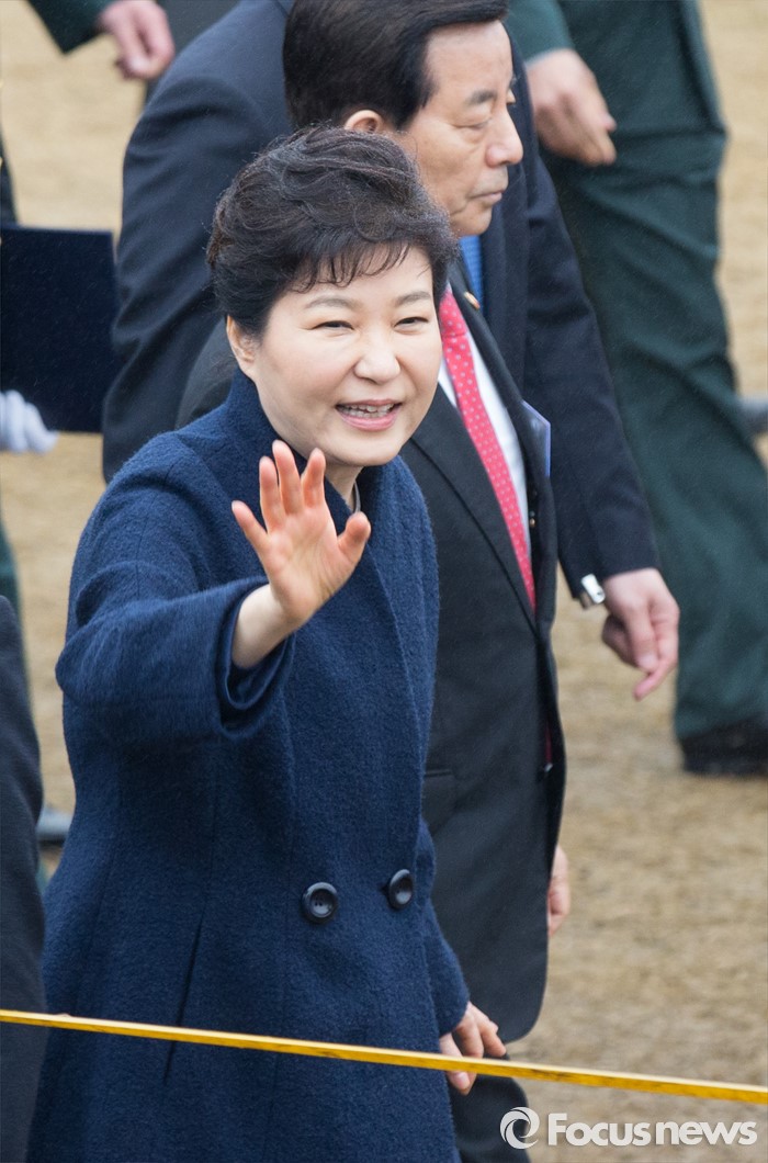 (계룡=포커스뉴스) 4일 오후 충남 계룡대 연병장에서 열린 2016년 장교 합동임관식에서 박근혜 대통령이 신임 장교들과 가족들에게 인사를 하고 있다.