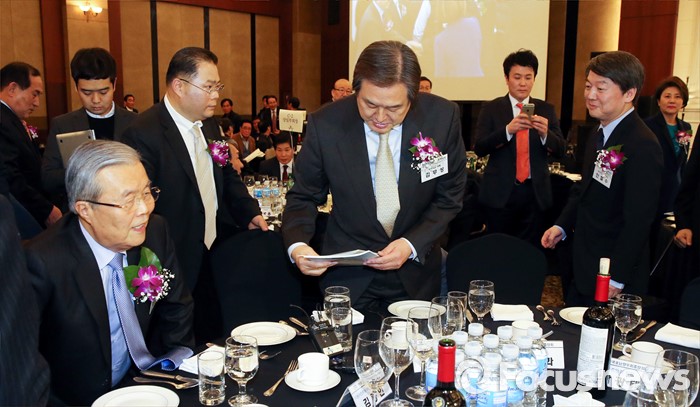 (서울=포커스뉴스) 안철수(오른쪽) 국민의당 상임공동대표가 4일 오후 서울 강남구 프리마호텔에서 열린 전국호남향우회 정기총회에 참석해 김종인(왼쪽) 더불어민주당 비대위 대표와 인사를 하기 위해 이동하고 있다. 가운데는 김무성 새누리당 대표.