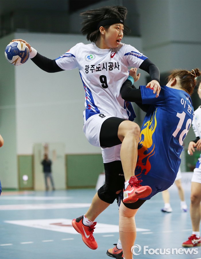 (인천=포커스뉴스) 4일 인천선학체육관에서 열린 2016 SK 핸드볼 코리아리그 여자부 인천시청-광주도시공사 경기에서 광주도시공사 서은지의 슈팅을 인천시청 이현주가 진로를 막으며 저지하고 있다.