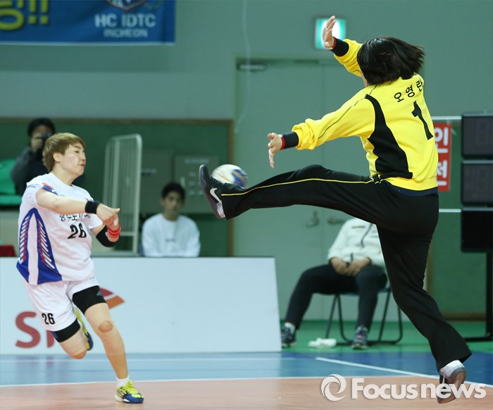 (인천=포커스뉴스) 4일 인천선학체육관에서 열린 2016 SK 핸드볼 코리아리그 여자부 인천시청-광주도시공사 경기에서 인천시청 골키퍼 오영란이 광주도시공사 조효비의 슈팅을 막아내고 있다.