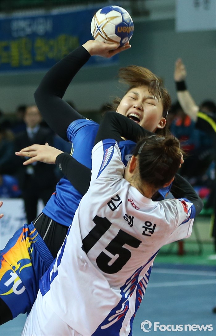 (인천=포커스뉴스) 4일 인천선학체육관에서 열린 2016 SK 핸드볼 코리아리그 여자부 인천시청-광주도시공사 경기에서 인천시청 원선필의 슈팅을 광주도시공사 김혜원이 몸으로 막고 있다.