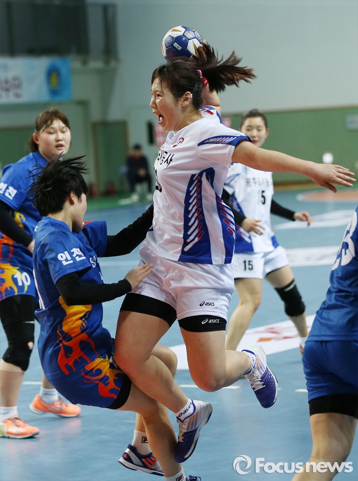 (인천=포커스뉴스) 4일 인천선학체육관에서 열린 2016 SK 핸드볼 코리아리그 여자부 인천시청-광주도시공사 경기에서 광주도시공사 허유진이 인천시청 김성은의 수비를 제치며 슈팅을 시도하고 있다.