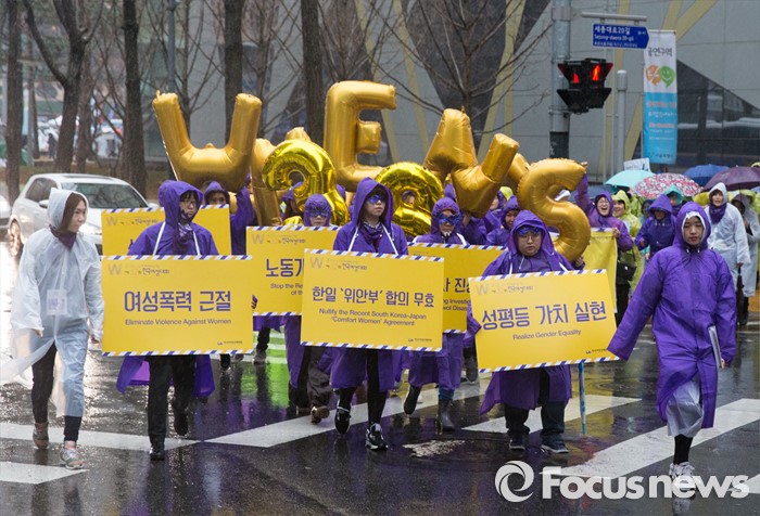 (서울=포커스뉴스) 5일 오후 세계여성의날(3월8일) 기념 제32회 한국여성대회를 마친 참가자들이 서울 종로구 일본대사관을 향해 행진하고 있다.