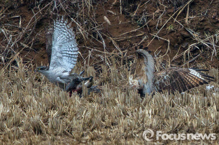 (철원=포커스뉴스) 북상길에 오른 멸종위기종 참매(왼쪽 천연기념물 323호)가 말똥가리에게 잠시 빼앗겼던 먹잇감 고방오리를 달고 달아나고 있다.