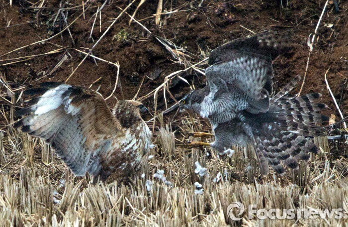 (철원=포커스뉴스) 북상길에 오른 멸종위기종 참매(오른쪽 천연기념물 323호)와 말똥가리가 6일 오전강원 철원군 동송읍 한탄강변에서 먹잇감을 놓고 서로 차지하려고 다투고 있다. 참매가 사냥한 고방오리를말똥가리가 기습해 잠시 차지했으나, 참매가 다시 빼앗아 달아났다.