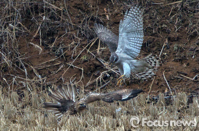 (철원=포커스뉴스) 북상길에 오른 멸종위기종 참매(오른쪽 천연기념물 323호)와 말똥가리가 6일 오전강원 철원군 동송읍 한탄강변에서 먹잇감을 놓고 서로 차지하려고 다투고 있다. 참매가 사냥한 고방오리를말똥가리가 기습해 잠시 차지했으나, 참매가 다시 빼앗아 달아났다.