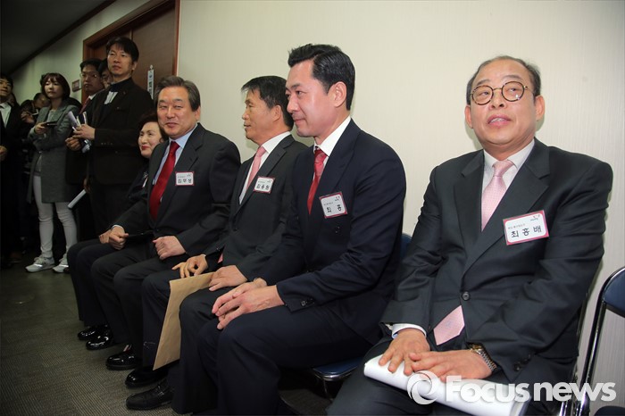 (서울=포커스뉴스) 부산 중구영도구에 출마하는 새누리당 김무성 대표가 6일 오전 서울 여의도 당사에서 열린 선거구변경지역 1일차 공천신청자 면접을 기다리며 옷 매무새를 고치고 있다. 왼쪽부터 권혁란, 김무성, 김용원, 최홍, 최홍배.