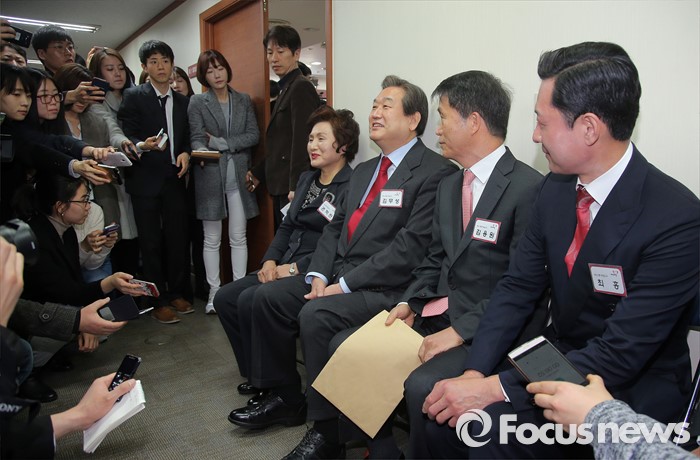 (서울=포커스뉴스) 부산 중구영도구에 출마하는 새누리당 김무성 대표가 6일 오전 서울 여의도 당사에서 열린 선거구변경지역 1일차 공천신청자 면접을 기다리며 예비후보자 들과 대화하고 있다. 왼쪽부터 권혁란, 김무성, 김용원, 최홍.
