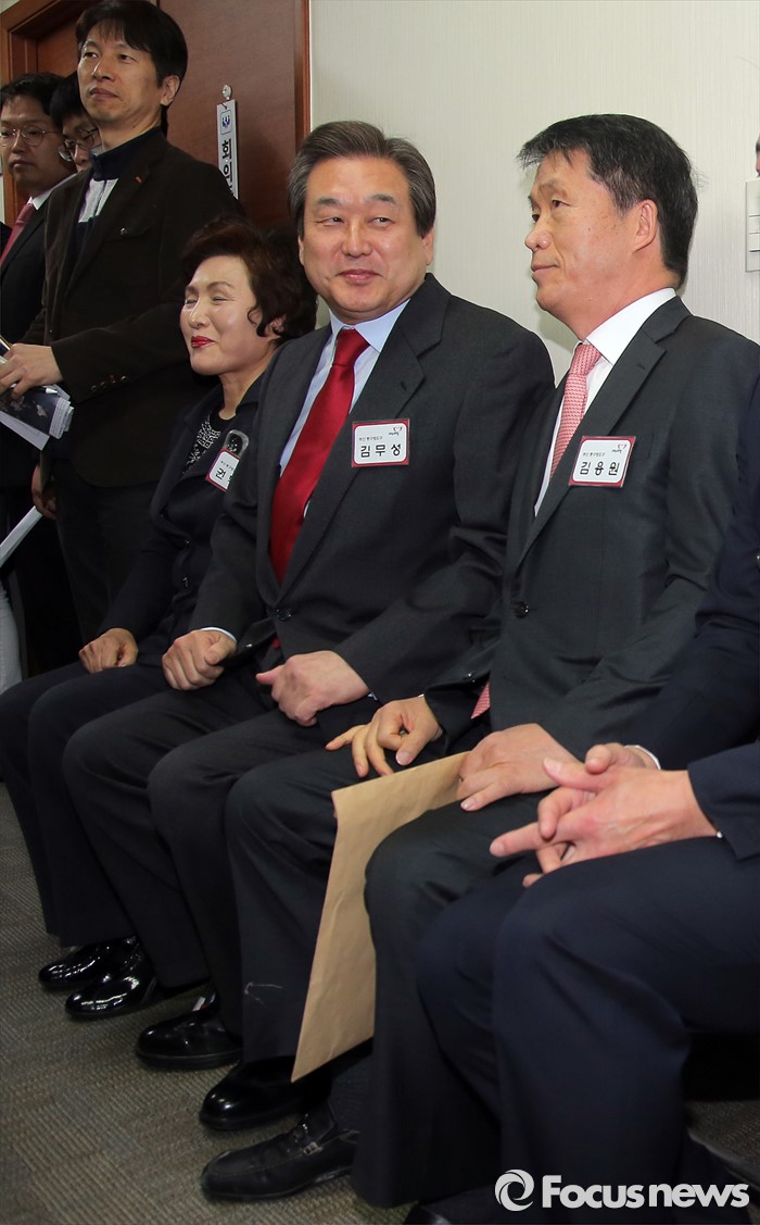 (서울=포커스뉴스) 부산 중구영도구에 출마하는 새누리당 김무성 대표가 6일 오전 서울 여의도 당사에서 열린 선거구변경지역 1일차 공천신청자 면접을 기다리며 옷 매무새를 고치고 있다. 왼쪽부터 권혁란, 김무성, 김용원.