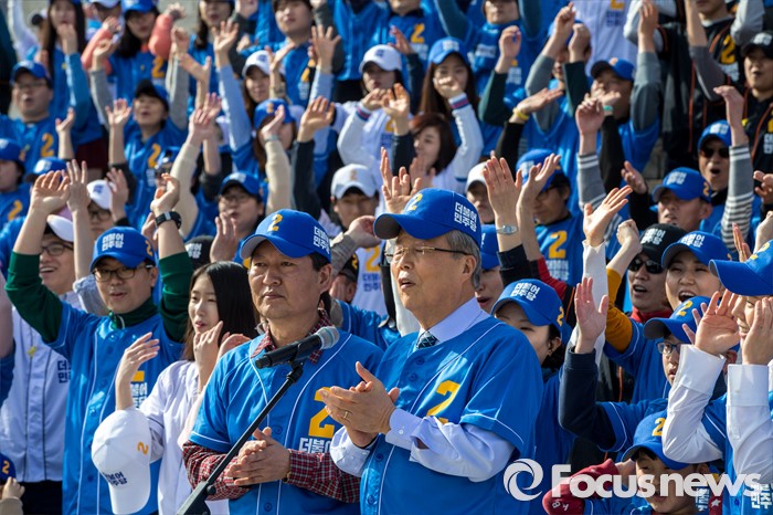 (서울=포커스뉴스) 김종인 더불어민주당 비상대책위원회 대표와 정청래 더불어민주당 의원을 비롯한 당원들이 6일 오후 서울 영등포구 국회 본관 앞에서 열린 '더불어민주당 총선 응원가 뮤직비디오 촬영'에 참여해 응원가를부르고 있다.
