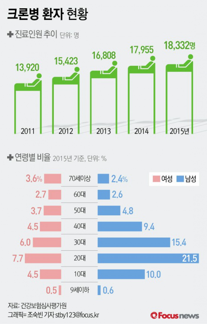 (서울=포커스뉴스) 6일 건강보험심사평가원(원장 손명세)이 ‘크론병'에 대한 최근 5년간(2011년~2015년) 심사결정자료(건강보험 및 의료급여)를 분석한 결과, 크론병 진료인원은 2011년 약 1만4000명에서 2015년 약 1만8000명으로 5년 전에 비해 약 4000명이 증가했다.