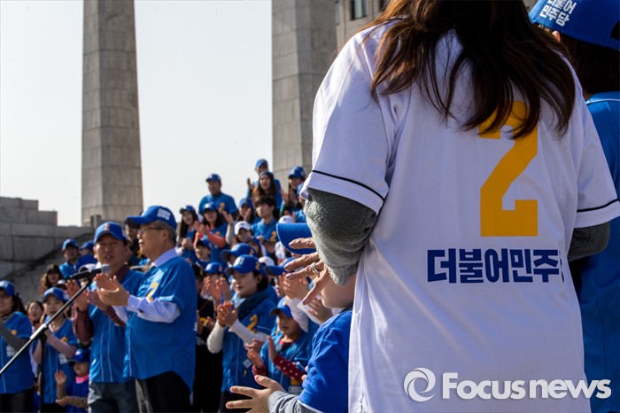 (서울=포커스뉴스) 김종인 더불어민주당 비상대책위원회 대표와 정청래 더불어민주당 의원을 비롯한 당원들이 6일 오후 서울 영등포구 국회 본관 앞에서 열린 '더불어민주당 총선 응원가 뮤직비디오 촬영'에 참여해 응원가를부르고 있다.