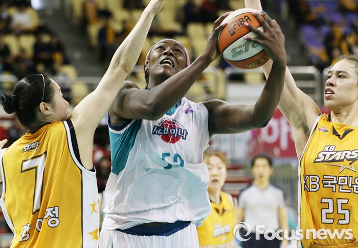 (부천=포커스뉴스) 6일 부천체육관에서 열린 2015-2016 여자프로농구 KEB하나은행-KB스타즈 경기에서 KEB하나 첼시 리가 KB스타즈 강아정과 햄비의 수비 사이로 골밑슛을 노리고 있다.