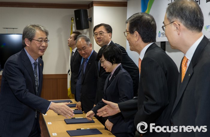 (서울=포커스뉴스) 7일 오전 서울 중구 금융위원회 대회의실에서 열린 '성과중심 문화 확산을 위한 금융위원회-금융공공기관 MOU 체결식'에 참석한 임종룡 금융위원장이 금융공공기관장 및 관계자들과 인사하고 있다.