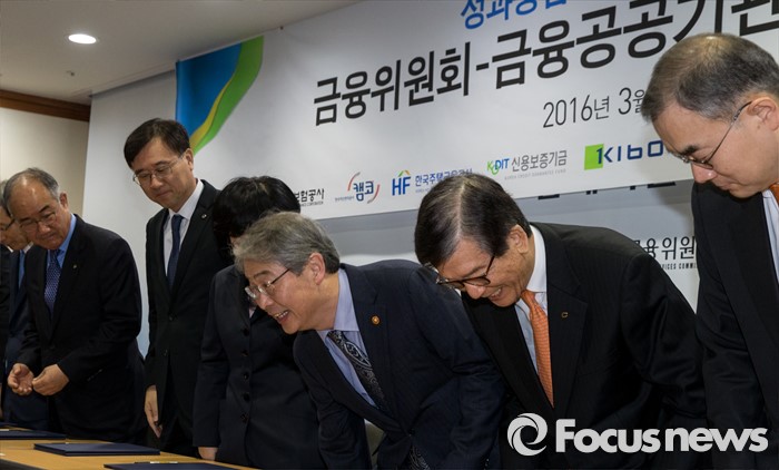 (서울=포커스뉴스) 7일 오전 서울 중구 금융위원회 대회의실에서 열린 '성과중심 문화 확산을 위한 금융위원회-금융공공기관 MOU 체결식'에 참석한 임종룡 금융위원장과 금융공공기관장 및 관계자들이 착석하고 있다.